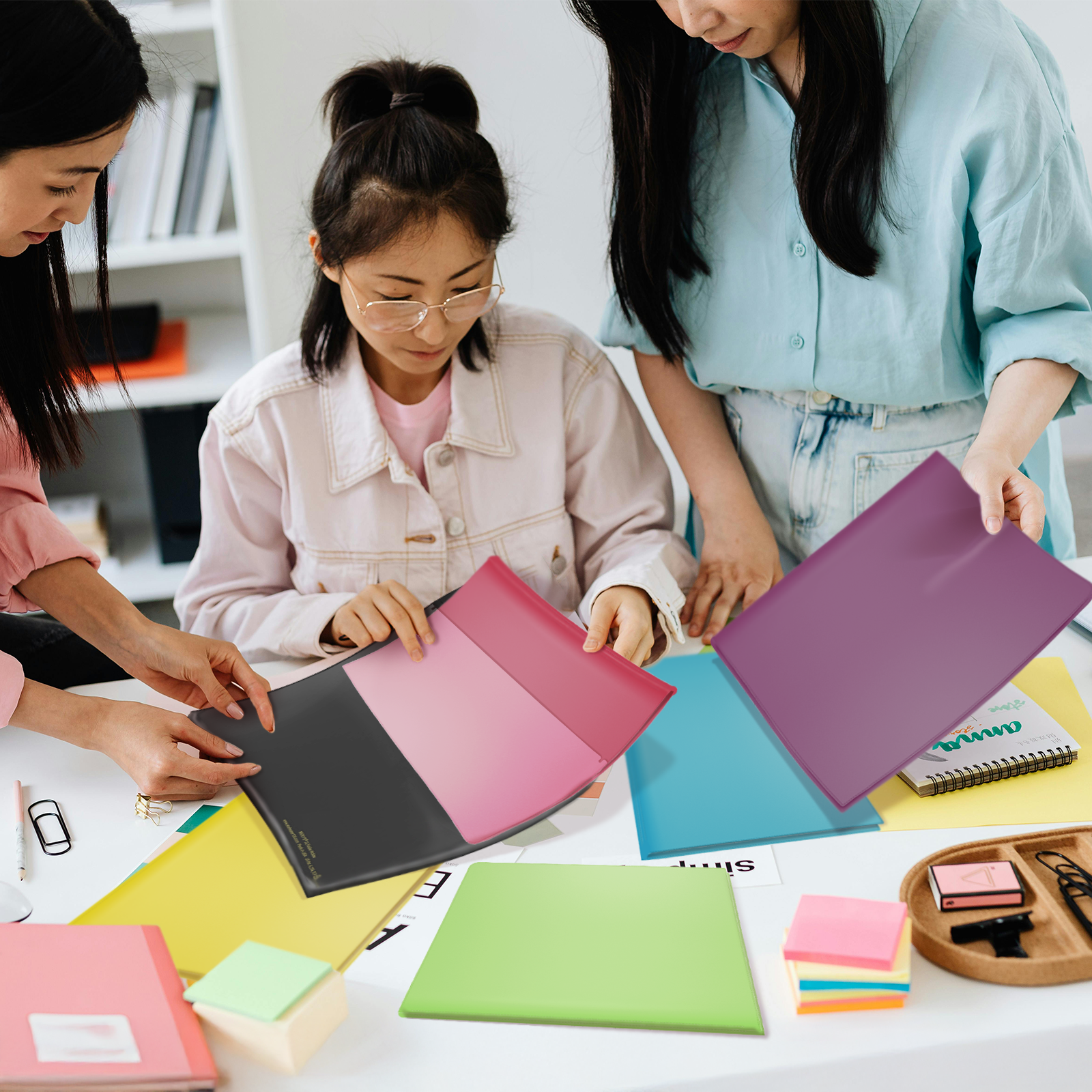 Two photobashed visuals were created to accompany the motion graphic, placing 3D product renders into both school and office settings to show the product in use. All folders and the folder holder are 3D assets, ensuring consistency across environments. The imagery supports the video by reinforcing key product details in a polished, on-brand way.